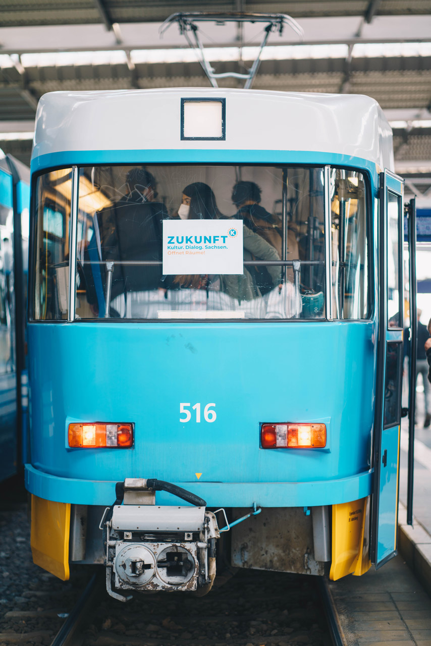 Wer am 29.4.22 im Chemnitzer Garagencampus um 10 Uhr aus der Tatra-Kulturdialog-Straßenbahn stieg, konnte sofort sehen und hören, dass die Kultur in Sachsen auch nach zwei Jahren Pandemie lebendig ist: Live-Tape-Art am Garagentor, Beats aus der Halle, gut gelaunte Menschen am Coffee-Truck und flatternde Fahnen im Morgenwind. Unter dem Namen “Zukunft hoch K” mit dem Untertitel “Öffnet Räume” startete der Kulturdialog im Garagencampus und über 100 Menschen aus nahezu allen Kulturfeldern aus Politik und Gesellschaft aus ganz Sachsen kamen, um sich zu beteiligen.